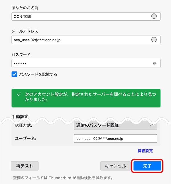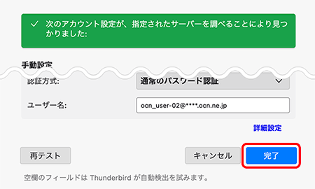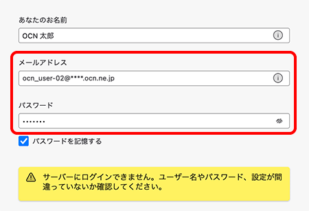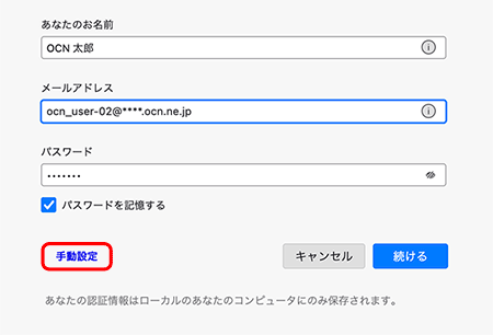 | ホスト名 | 自動入力される設定値を smtp.ocn.ne.jp に書きかえる |
