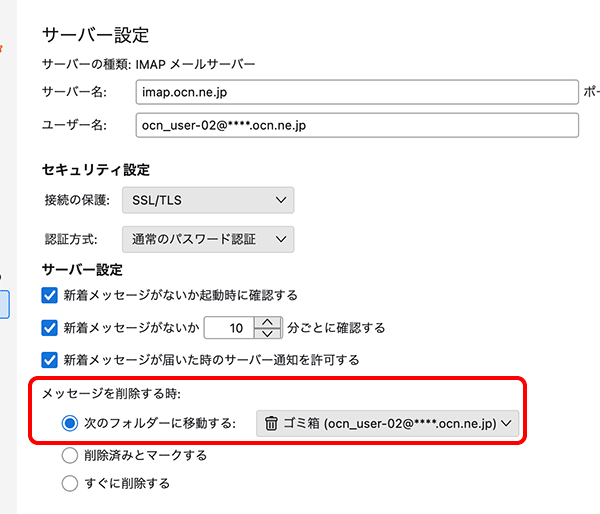 ※[次のフォルダーに移動する]以外を選択した場合、メールを削除するとゴミ箱に移動せず、すぐにThunderbird上から削除されますのでご注意ください。