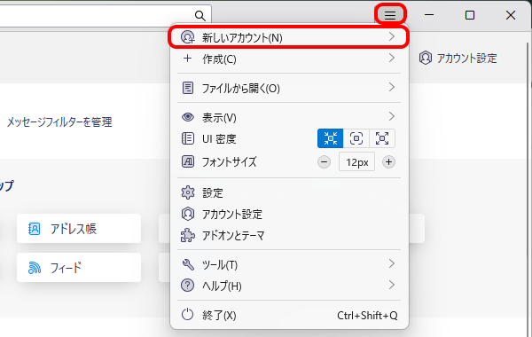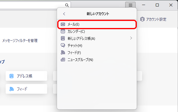 メニュー]-[新しいアカウント]をクリックします。※[既存のメールアドレスのセットアップ]画面や[アカウントハブ]画面が表示された場合は、STEP4に進みます。