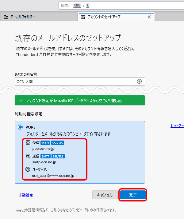 | 受信 | POP3 SSL/TLS pop.ocn.ne.jp と表示 |