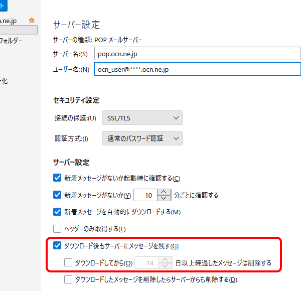 | ダウンロードしてから~日以上経過したメッセージは削除する | Webメールや他の端末でも同じメールを受信する場合はチェックしない |