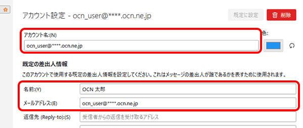| アカウント名 | 受信トレイや一覧で表示する、このアカウントの名称を入力 例)「OCN」「仕事用」など |
