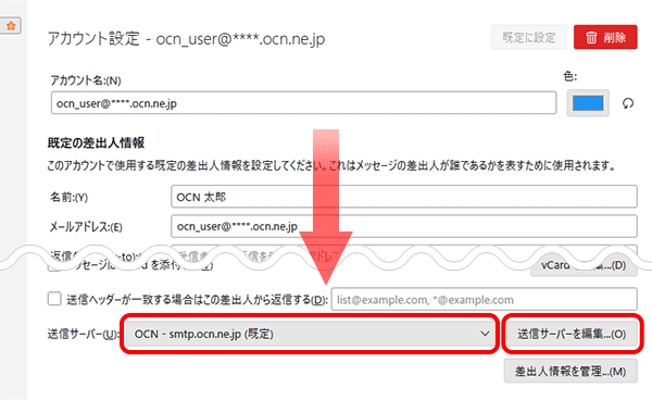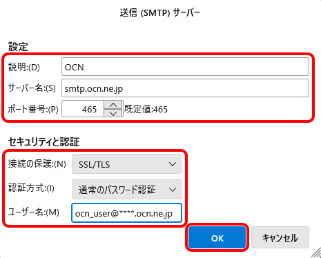 | サーバー名 | smtp.ocn.ne.jp と入力 |