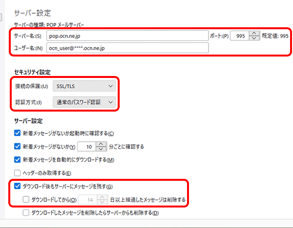 | サーバー名 | pop.ocn.ne.jp と入力 |