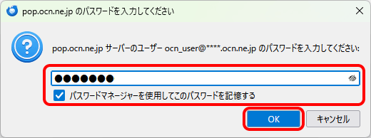 | パスワードマネージャーを使用してこのパスワードを記憶する | 送受信時にパスワード入力を省略したい場合はチェックする |