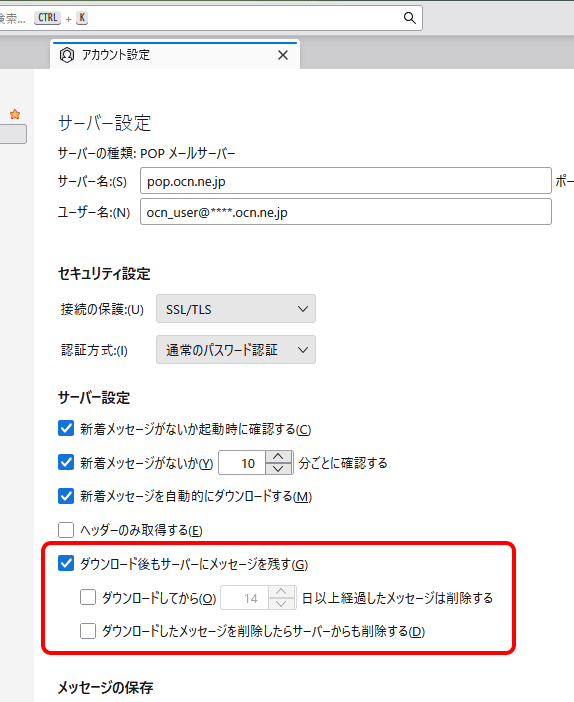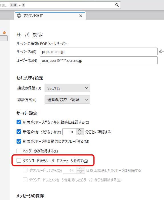 [サーバー設定]欄の[ダウンロード後もサーバーにメッセージを残す]のチェックをはずし、完了です。