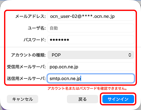 | 受信用メールサーバ | pop.ocn.ne.jp と入力 |