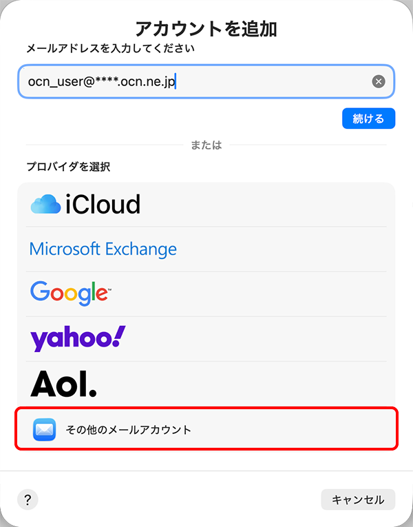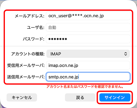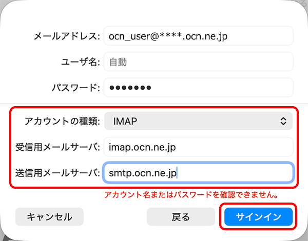| 受信用メールサーバ | imap.ocn.ne.jp と入力 |