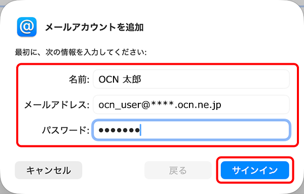 | 送信用メールサーバ | smtp.ocn.ne.jp と入力 |