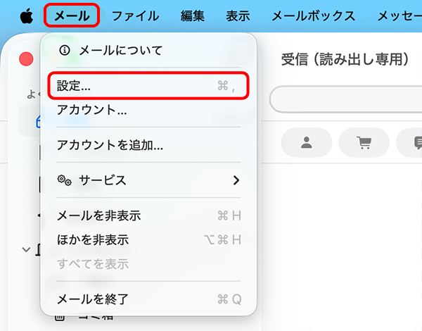 メニューバーの[メール]-[アカウントを追加]をクリックします。
