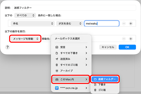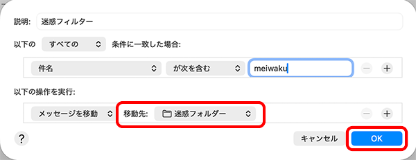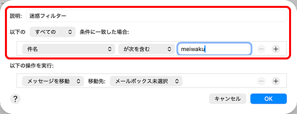 | 以下の ~ 条件に一致した場合 | [すべての]を選択。続けてその下で[件名]と[が次を含む]を選択し、入力欄に meiwaku と入力 |