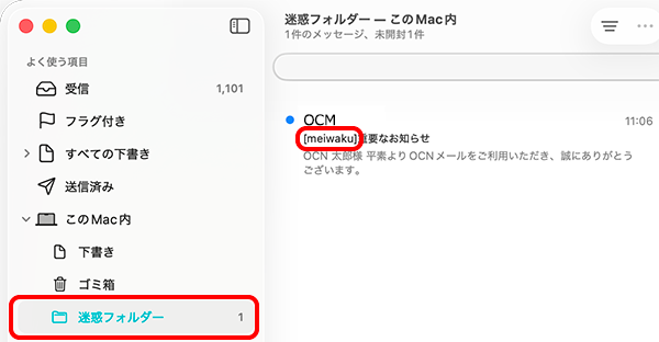 OCNの[迷惑メール自動判定]で迷惑メールと判定されたメールを、macOS Tahoeでフォルダーに振り分ける方法をご案内します。