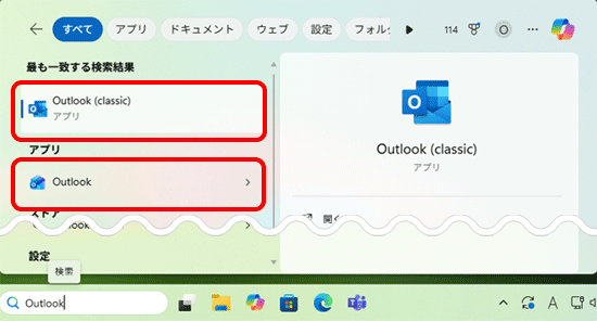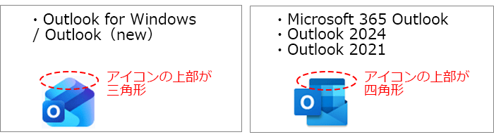 PCに「Outlook 2021」または「Outlook for Windows / Outlook(new)」のどちらかがインストールされており、アイコンで見分けることができます。以下の表を参照してください。