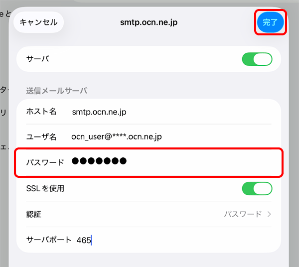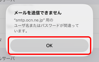 [OK]をタップして設定画面に戻り、[送信メールサーバ]のパスワード入力に誤りがないかご確認ください。