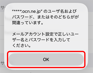 [OK]をタップして設定画面に戻り、[受信メールサーバ]のパスワード入力に誤りがないかご確認ください。