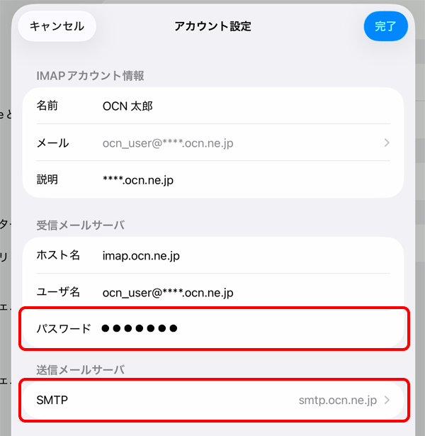iPadOS 26の標準メールアプリで、IMAPで設定したOCNのメールパスワードを変更する方法をご案内します。