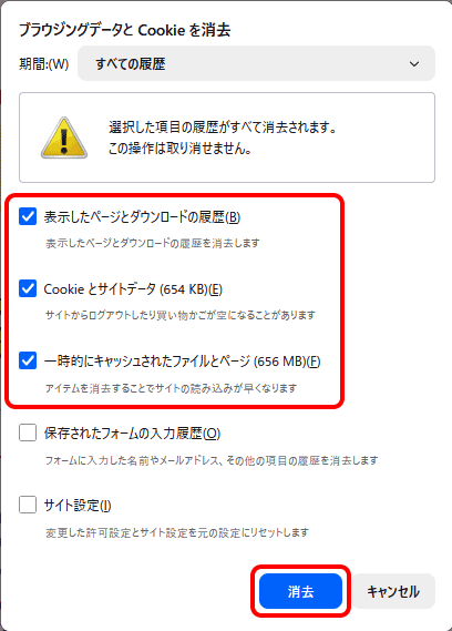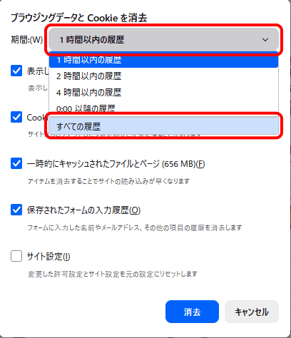 [ブラウジングデータと Cookie を消去]画面が表示されますので、STEP4にお進みください。