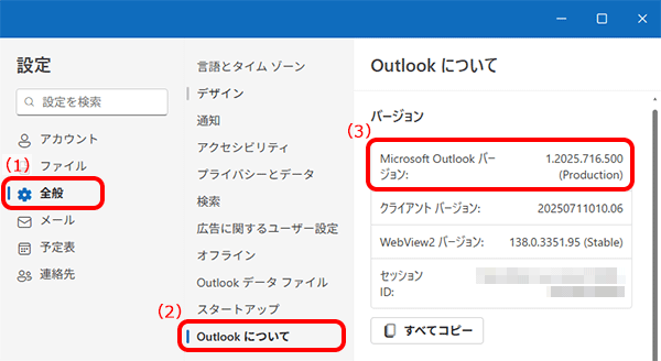 (1)[全般]、(2)[Outlook について]の順に選択すると、(3)Outlookのバージョンが表示されます。